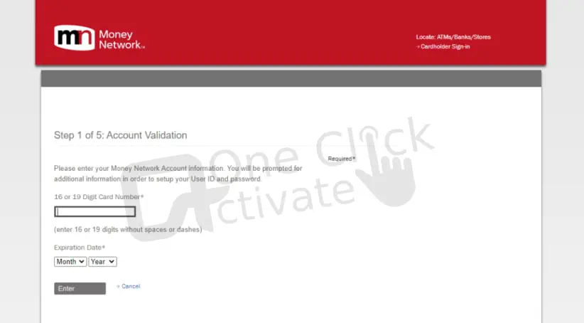 After clicking on the Enter Now button on the following page, you will be taken to the registration page for your Money Network Card.