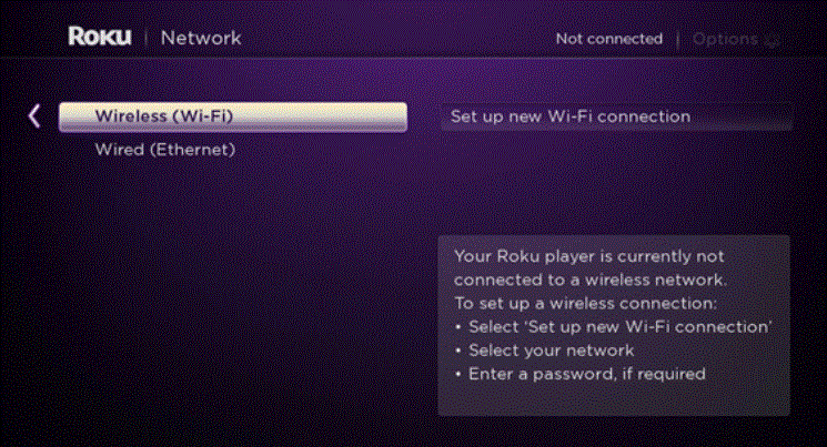 If your Roku device is not correctly connected to the available network, the Check connection option will not be shown on the menu. Instead, you will see the option to Set up a connection.
